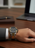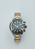 ⚡️ Unmistakable Design: Features a large, aggressive case with striking gold-tone bezel accents that frame a deep black chronograph dial.